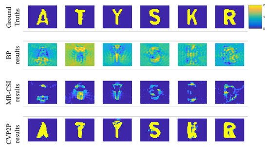 We carry out another set of numerical simulations so as to verify the superiority of the method. In this test, the MNIST dataset is still invoked as the training set of CVP2P. Meanwhile, the test objects have the shape of English letters and the relative permittivity is set to 3. Other parameters are all the same as the Example 1.