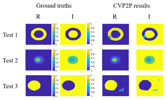 The performance of CVP2P is assessed from the two aspects of simulation and experiment. For comparison, we also test the corresponding results of the Multiplicative Regularization Contrast Source Inversion (MR-CSI) method, both of which employ the Green’s integral equation to generate the measured data in simulation as Equations (1) and (2).