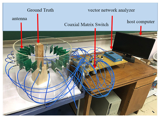 The system works at 3–5 GHz with 24 balanced Vivaldi antennas, which are evenly placed on a cylinder with a radius of 22.5 cm. Each Vivaldi antenna is 7 cm long, and it is 7.3 cm wide.The maximum imaging domain, D, consisted of a circle of radius 17 cm, located at the center of the chamber. If a square domain is used, the maximum size is a length of 18 cm. In practice, we have used a maximum imaging domain, D, with 10 cm sides. A vector network analyzer (KC901V) is connected to antenna via Agilent Coaxial Matrix Switch for transmitting and receiving signals, which provided port isolation of greater than 100 dB over the frequency range of interest. A host computer is connected to the vector network analyzer via USB to collect data. One antenna is used as the transmitting antenna, and the other 23 antennas are used as the receiving antenna, and the 1 × 23 transmission measurements of is obtained. Replace another antenna as the transmitting antenna and repeat the same operation. All data sets had 24 × 23 23 transmission measurements of (reflection measurements, , were excluded from these data). The target is made of a square wooden block with a side length of 5 cm. For numerical simulations, the imaging region is a square with size of 0.1 m × 0.1 m, which is evenly divided into 64 × 64 sub-squares.