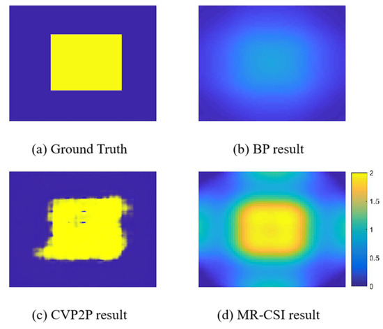We use CVP2P trained by MNIST dataset to test the experimental data. Figure 7a shows the target (Ground truth) where the yellow object is a square wooden block and its relative permittivity is 2. Figure 7b–d shows the results of the BP, CVP2P and MR-CSI method at the working frequency of 4.4 GHz, respectively. Although the experimental data is extremely different from the simulated data of the MNIST dataset, the results of the CVP2P are satisfactory and superior to the MR-CSI in terms of image quality and computational efficiency. It should be noted that it takes 10 min and 1000 iterations for MR-CSI to produce these results. The computational time of the CVP2P is less than 1 s, which is much faster than MR-CSI.