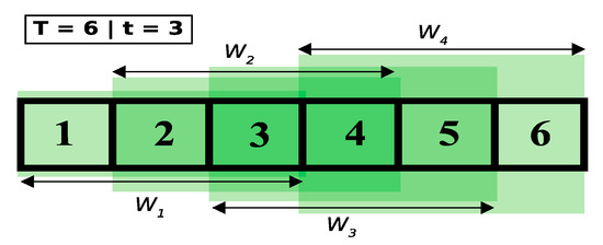 Let us give an example. Let us assume a sliding window with a size equal to three packets (t = 3) and a dataset with a size of six packets (T = 6). Then, applying (5), vector L would have four elements (N = 4).