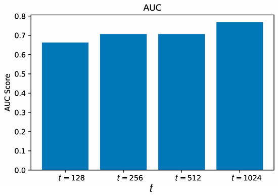 In addition, we tested this process using different window sizes, from t = 128 to t = 1024 packets and observed the AUC score. The best performance was obtained for larger window sizes (1024 packets). For small values of t, overfitting occurred due to insufficient data. This effect was clearly avoided by increasing t because the amount of false positives was highly reduced (see Figure 5).