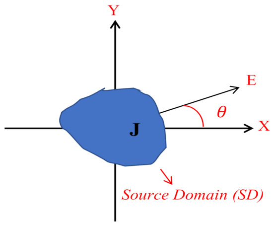 At first, we will address a general inverse source problem which is depicted in Figure 1. A scalar 2D source current radiates in a homogeneous medium with dielectric permittivity and magnetic permeability , referred to as the source domain (SD). The observation direction of the radiated far-field is denoted by .