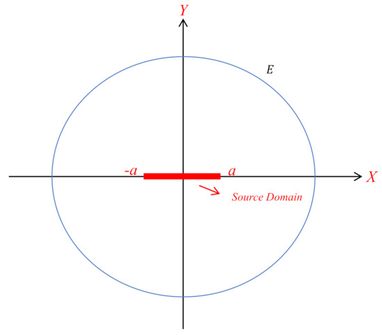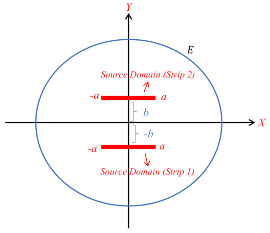 The same analysis as Section 3.1 is here extended to address the case of two parallel stripes along the x-axis, as shown in Figure 17. We suppose two strips are located at and , respectively, and is the distance between them. We will show the influence of the of strip 1 on the other strip.