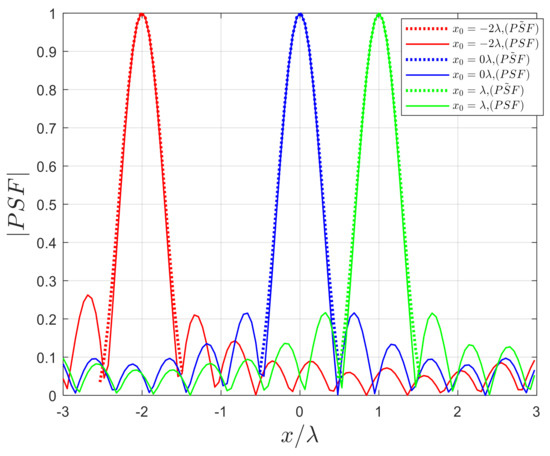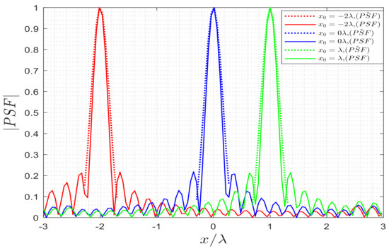The analytical is verified using a numerical implementation of the imaging process when it can be assumed that one or more-point scatterers are located at an arbitrary position of the investigation domain. The PSFs for three-point scatterers located at , , and are shown in Figure 15. Since the is a function only of we have arbitrarily selected the point scatterer locations along the x-axis. It can be observed that the resolution remains unchanged as the position of varies. All point-like scatterers can be imaged in the same way, independent of their positions.