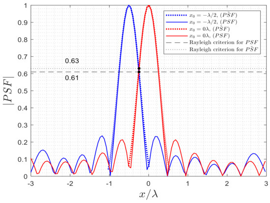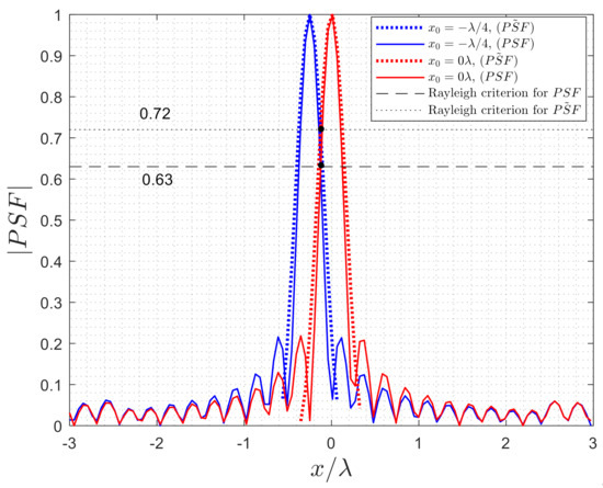 In the inverse scattering problem, as can be seen in Figure 16, the width of the main lobe of and for a point scatterer is equal to ; thus, it can be defined that the minimum distance between two-point scatterers should be λ/4 to achieve a resolvable resolution. Then, the image can be made by the combination of both PSFs of two-point scatterers. To this end, we consider two-point scatterers located in and to show the Rayleigh criterion (see Figure 16). As can be observed, the intersection point of the s (dotted black line) is approximately close to the intersection point of the PSFs (dashed black line).