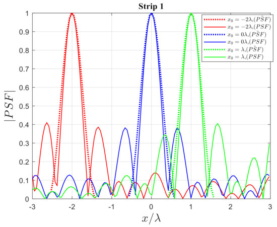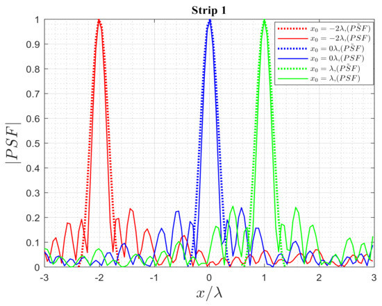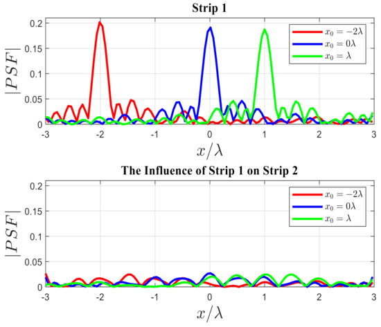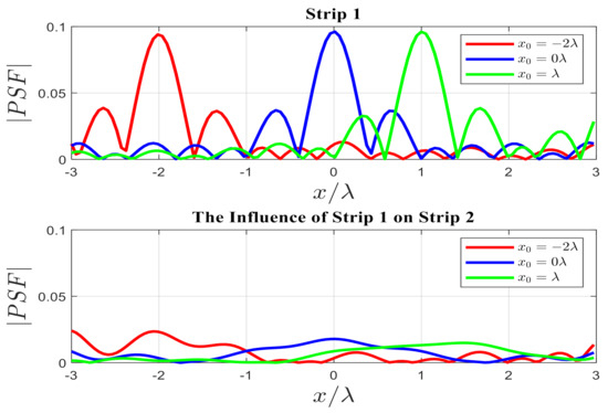 The first numerical simulation refers to the influence of the actual of strip 1 on strip 2. As shown in Figure 18, three different source points are located at , , and . As can be observed, if the location of the point scatterer changes, the width of the main lobe does not change, which means the resolution remains constant; however, the height of the PSF can vary. Furthermore, the PSF of strip 1 cannot affect strip 2.