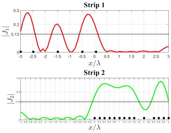 In order to relate the above-discussed concepts and numerical simulations to a practical application concerning the resolution issue in inverse source problems, we provide a numerical example concerning the diagnostics of faulty elements within an array antenna. It is composed of two sub-arrays of isotropic elements: one is located along the left part of strip 1 and is composed of 7 elements spaced at a uniform step, while the other one is located along the right part of strip 2 and is composed of 16 elements spaced at a uniform step. The elements of each sub-array are excited according to (different) constant values, chosen in such a way that each sub-array radiated the same power. Then, we suppose that two elements are inactive in each sub-array, as plotted in Figure 8, and we require them to be located by inversion of (15) by the truncated singular values decomposition (TSVD) algorithm. Here, since the array source is considered a particular case of a continuous source function, we can introduce a threshold value (dotted line) for the reconstructed amplitude of the current at half of its maximum values and decide that an element is off whenever the current value at its location is lower than the threshold. It can be expected that when the distance between two elements is lower than the resolution limit, it is not possible to reconstruct them reliably. Thus (see Figure 8), the diagnostics procedure is reliable for the sub-array of strip 1, as the presence of defective elements can be unambiguously detected. In contrast, it is impossible to reconstruct every set of the excitation coefficients of the sub-array of strip 2. Since an antenna testing engineer must be confident that every collection of the excitation coefficients of the array must be retrievable, the reliability of the inversion algorithm can be significant and useful.