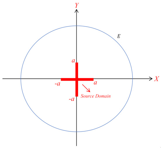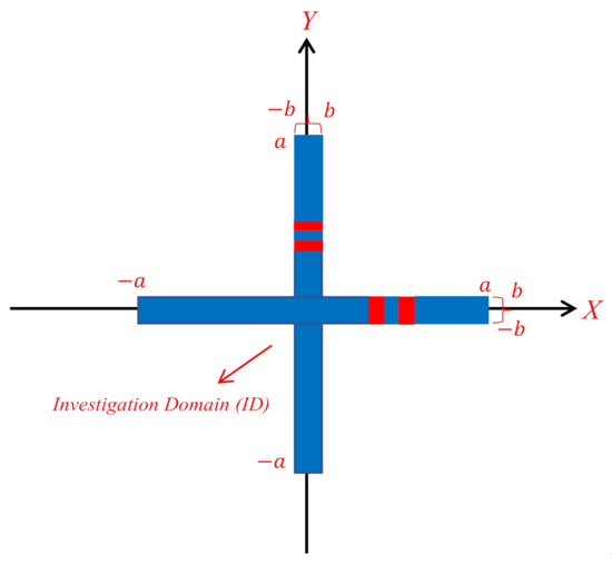 The practical relevance of the above discussions can be shown by the numerical reconstruction of a cross dielectric strip with , and , as illustrated in Figure 24. Then, we suppose that two cracks (free space condition, ) exist in each strip (denoted by the red regions): along the horizontal strip, the length of each crack and the distance between them is along the vertical strip, the length of each crack and the distance between them is .