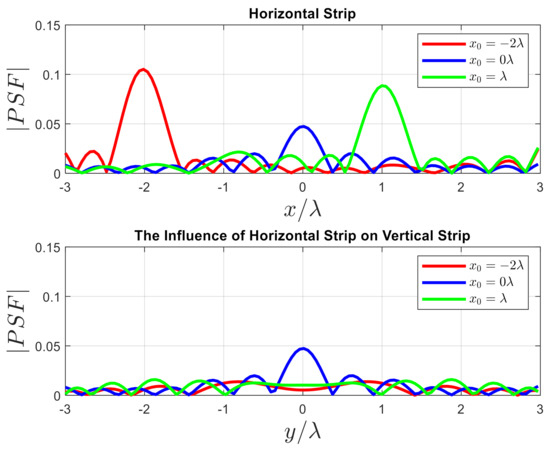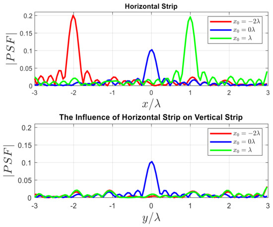Figure 10 shows the influence of the PSF of the horizontal strip on the vertical strip. As shown, the of can equally affect both strips. On the other hand, the of the other point scatterer cannot affect the vertical strip. We observe again that by changing the position of the point scatterer, the width of the remains constant; however, the amplitude varies.