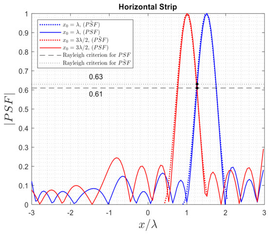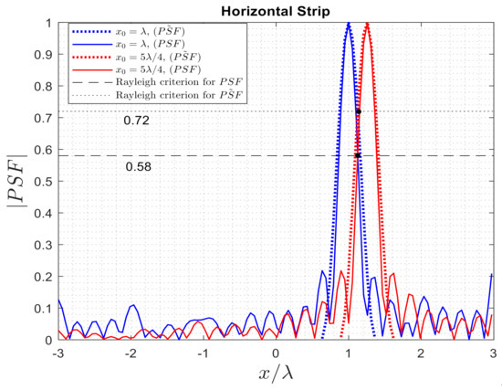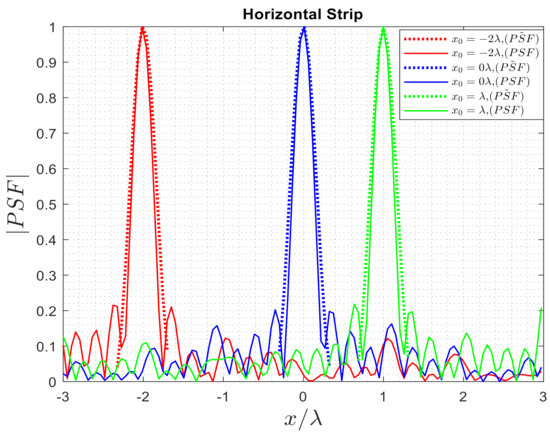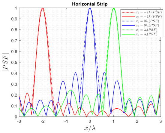 The PSFs were previously defined for the 2D case in Section 2 so that it can be easily derived from Equations (9) and (11) for one strip case by replacing and instead of and , respectively. The approximated for one strip is obtained by
