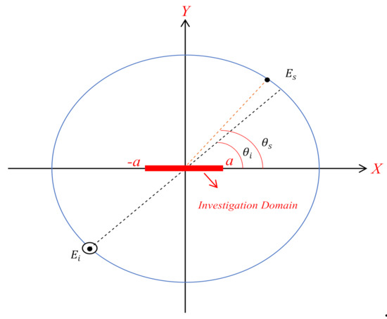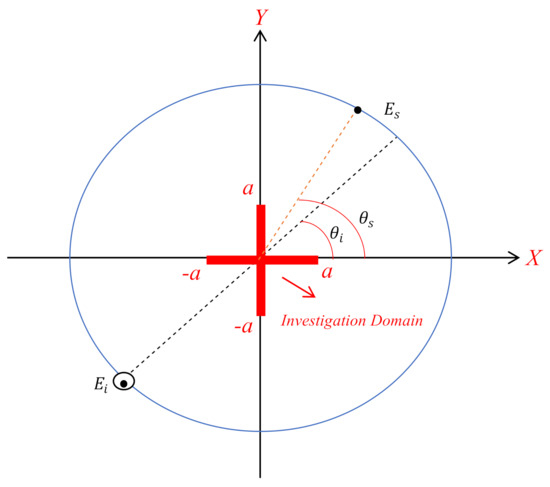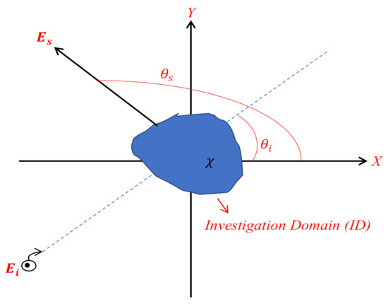 Let us consider that an unknown scatterer is located in a domain referred to as the investigation domain (ID), and the incident plane wave , propagating along the direction illuminates it; then, for each angle of illumination, the scattered fields are observed at the observation angles in the scatterer’s far zone.