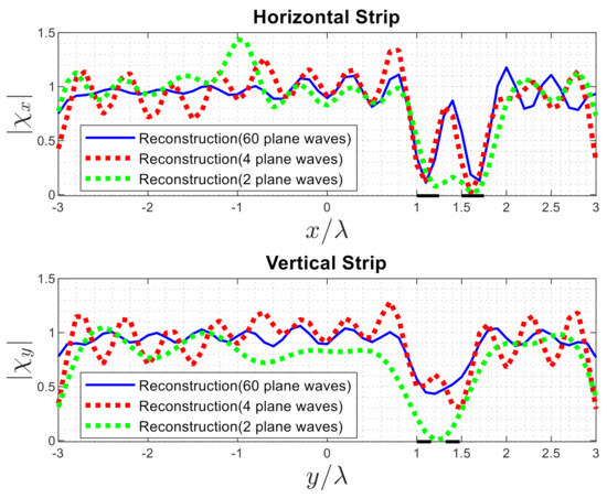 Figure 25 illustrates the reconstructions by inversion (34) by the TSVD algorithm for different numbers of plane waves. We expect to confirm the resolution limit and to show that only four plane waves are enough to achieve the best reconstructions [26]. As can be observed, by considering only four incident plane waves (red line) along the horizontal strip, it can be distinguished that two cracks are present; oppositely, it is impossible to differentiate between two cracks in the vertical strip, even with the maximum number of incident plane waves. Therefore the resolution analysis is important for the reliable reconstruction of defects in dielectric objects in inverse scattering problems.