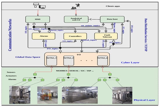 The applications of the fourth industrial revolution require great flexibility on the part of industrial cyber-physical systems (ICPS) to achieve optimal operating points that integrate the entire value chain of a process. This requires the capture of new data that are subsequently processed at different levels of the hierarchy of automation processes, with requirements and technologies according to each level [2,3,4,5]. This presents challenges related to the incorporation of new functionalities in the processes and the interoperability between them with the collaboration between distributed nodes. This is easier to achieve with flat architectures based on services that allow horizontal interaction between components based on information.