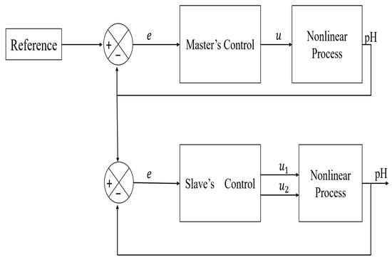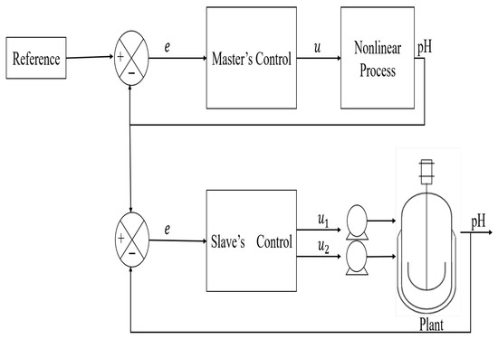 For the final formulation process of any of the products made at Punta Delicia and mentioned above, pH control is crucial and each of the products to be processed has its own requirements, characteristics, and considerations. In addition, such processes present complicated dynamics with inherent non-linearities, and their modeling, parameter estimation, and control are challenging and delicate tasks. Thus, the design of high-performance model-based control algorithms for bioprocesses is frequently hampered by its complexity, which can include poorly understood nonlinear functions, due to the limited process knowledge, nonlinearities, unmodeled dynamics, unknown internal and external noises, environmental influences, and time-varying parameters. Hence, the problem considered in this work was an easily scalable pH controller that forces the process measurements to follow a desired time-varying reference, despite uncertainties like scaling-up processes. The control algorithm implemented is based on a master-slave synchronization, where the real process is the slave, while the master is generated by the real-time simulation of the closed-loop mathematical model of the process. Then the objective is the pH control with minimal process information, considering a time-varying reference ranging between the basic and acid region. This algorithm forces the process measurements to follow a desired time varying reference, despite uncertainties like scaling-up processes. For this purpose, a master–slave synchronization scheme is used derived by [35,36]. The design of a high-performance model-based control algorithms is frequently hampered by its complexity. Moreover, the poor understanding of nonlinear functions, due to the limited process knowledge, nonlinearities, environmental influences, and time-varying parameters, lead to hardly controlled problems that certainly can be tackled by data-based alternatives, such as intelligent ones [37,38,39]. However, the need of easily implemented solutions, robust to unmodeled dynamics, unknown internal and external noise, could be tackled by simple robust nonlinear controller that can be easily implemented. The advantages of this concept are that the syntonisation can easily be performed for a simplified model and the controller can be designed such that the real process is synchronized with the master in spite of the bounded unknown dynamics and perturbations in the real plant.