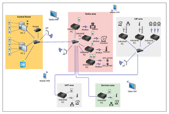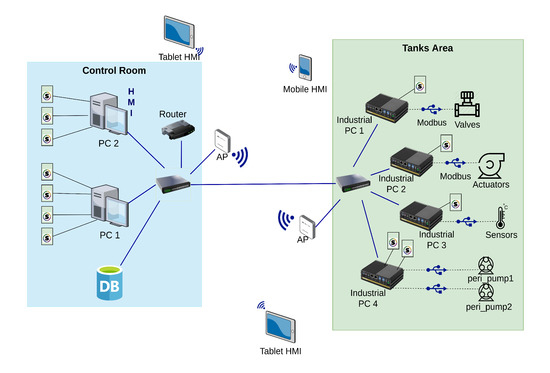 The implementation begins with hardware architecture, mainly with the selection and location of equipment and interconnection between them. Wireless and wired equipment is installed, computers for sensing and actuation are wired for the greater certainty of communication, and other equipment such as displays and manual commands can be implemented in both wired and wireless ways. In the embedded-PC platform, we set up devices with the following characteristics: Intel Celeron J3060 1.60 GHz, 2 GB in RAM and 32 GB of emmc, 2 PC’s with web services, controllers and monitoring functions Intel Xeon E3-1225V5 3.30 GHz, 32 GB DDR4, and a server with Intel Xeon C620, 32× 284 DDR4 and 15.36 TB to store the different databases. Additionally Access Point, switches and routers for network management, 4 display monitors for HMI functions located in the control room, and finally a series of mobile devices that allow the visualization and execution of commands from any space in the industrial plant. Figure 6 shows the distribution of the hardware used so far for the control and current operation of processes implemented in the juice and beverage production plant at Punta Delicia.