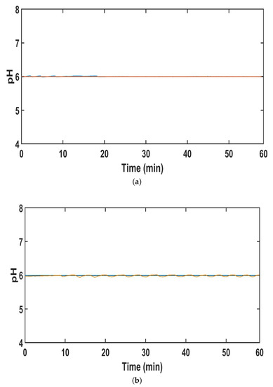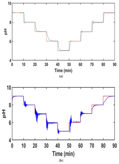 The figure shows the result of the pH control for simulated and real processes, respectively, by master–slave synchronization, in a stirred tank with a volume of 1500 L for scaled industrial process. (a) pH reference and pH measured for simulation, (b) pH reference and pH measured for industrial-scaled process.