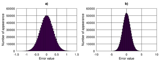 Figure 4. Histogram of the (a) input quantity error, (b) output quantity error, wavelet “spline4:4”, four levels of decomposition.