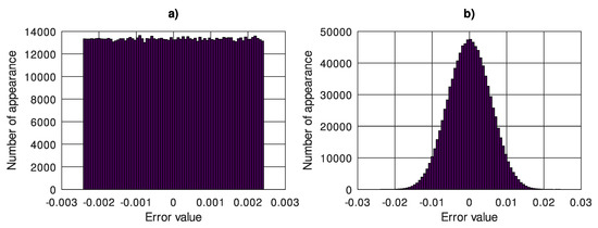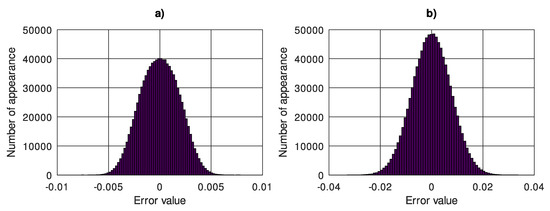Assuming a measurement chain containing the AD converter described in the previous chapter and an analog part where the white noise is present, the Monte Carlo method can be applied to find the parameters of input values error distribution. In this case, the sources of errors have uniform distribution with coverage factor c u = 1.65 , variance σ 2 = 0.2 × 10 5 and normal distribution with coverage factor c n = 1.96 , variance σ 2 = 0.15 × 10 5 . Because the considered error distributions are standard, the analytic method described in [19] can also be easily applied, but in order to emphasize the universality of the presented method, the Monte Carlo method is taken under consideration. In the case of more than two error sources, the analytic method might be not applicable.
