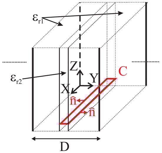 As described in Section 1, some confusion may exist in the evaluation of the one-dimensional integrals that appear in the calculation of the L-matrix (see Equation (10)), when the relative dielectric permittivity is a discontinuous function; this may even apply to the simpler case of two dielectric slabs in the periodic cell of relative permittivities and (see Figure 2), as will be analyzed in Section 3, defined as a Heaviside function—i.e., it has a constant value of and in and outside of a domain of definition delimited by the contour C—. For convenience, we will choose a curvilinear coordinate system [] defined by the curvilinear coordinates , being n and , respectively, the normal and tangential coordinates to the contour C, and z coinciding with the Cartesian coordinate. In this coordinate system, both the relative permittivity and its gradient may be expressed as follows:
