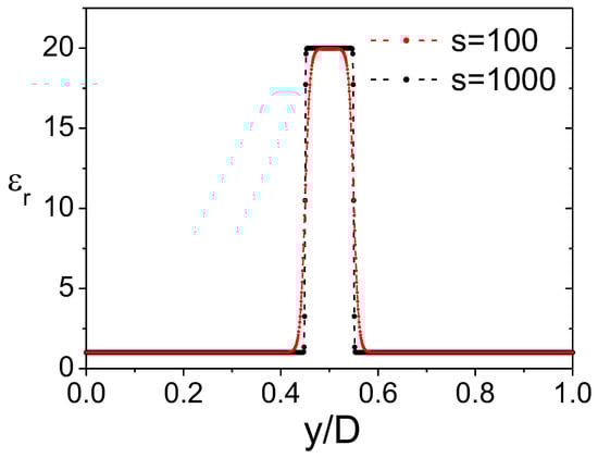In Figure 3, we show the relative dielectric permittivity function for different values of the parameter s. It can be checked that, in this case, the relative permittivity function is very well approximated by the continuous function defined in Equation (25) using a value of . In the problem under consideration, we have chosen a working frequency of 10 GHz, and we have taken the Floquet modes under normal incidence of a homogeneous medium of relative permittivity and periodicity D as the auxiliary basis in the calculation of the L-matrix. In Table 1, we present the relative difference between the result obtained for an element (in particular, ) of the second integral in Equation (10) employing the function of Equation (25), with respect to that obtained using Equation (22) for different values of the parameter s. Obviously, as the parameter s increases, the relative difference rapidly decreases.