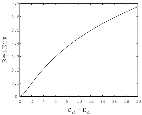 Now, we will analyze the effect of the dielectric permittivity in the deviation of the value of the second integral in Equation (10) when it is not correctly evaluated. To this end, we have plotted, in Figure 4, the deviation of the constant factors appearing out of the integral in Equations (22) and (23), which are obtained by evaluating the term or the term , as a function of the difference of the relative dielectric permittivity . For small differences in the relative dielectric permittivity, the deviation is not important, but as the difference becomes higher, the deviation between both results becomes significant.