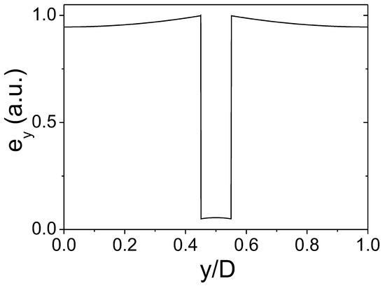 Finally, we want to show the effect of the evaluation of the integrals in the discontinuity in both the propagation constant and the fields, when the second integral of Equation (10) is evaluated as in Equation (22), or by using the result of Equation (23). To this end, we chose the same example that was previously described in Equation (24), with parameters , , and , again under normal plane-wave incidence. Table 2 displays the normalized propagation constant of the two modes which are propagative at the working frequency of 10 GHz, the first one being a mode with TE polarization, while the second mode has a TM polarization. We compare the results obtained with the vectorial modal method for both ways of evaluating the discontinuity (as in Equation (22) or by using the result of Equation (23)), considering 30 vector mode functions as the auxiliary basis in the calculation of the L-matrix for reaching the convergence (in this case, with a 0.5% relative error). Such results are also compared with those numerically obtained with Ansys HFSS, for which the computation time was two orders of magnitude greater in the same machine, thus highlighting the advantage of the present vectorial modal method in terms of efficiency. We also represent, in Figure 5, the y-component of the transverse electric field for the first propagative TM mode in this structure.