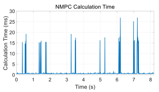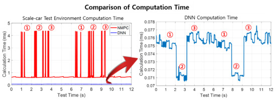 One of the main goal of this study was to reduce the uncertainty in the computation time of the NMPC method. Consequently, we replaced the NMPC method with the DNN-based control method. The computation times of the two controllers were analyzed in the scaled-car environment; the results are shown in Figure 18.