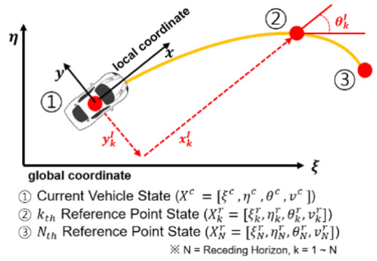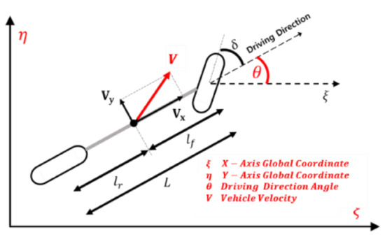 The vehicle prediction model of the NMPC method uses a four-state kinematic model constructed in the global coordinate system (x,y). The states are defined in Figure 3: