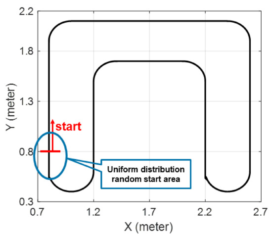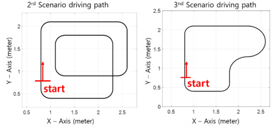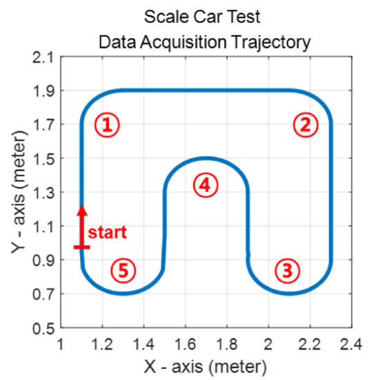 The data acquisition scenario in the scaled-car test is shown in Figure 13. The NMPC control period, number of receding horizon steps, and target velocity were 20 ms, 30, and 1.0 m/s, respectively. The data were acquired along the path in simulation scenario 1.