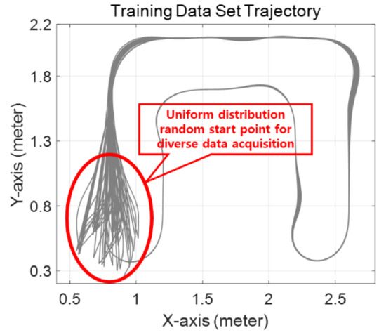 To generate diverse training data, the position and direction of the initial vehicle were randomly determined with a uniform distribution. After approximately 13 min of simulation, a rich-diversity 39,000 training dataset was obtained. The driving trajectory of the simulation for data acquisition is shown in Figure 7.