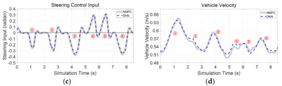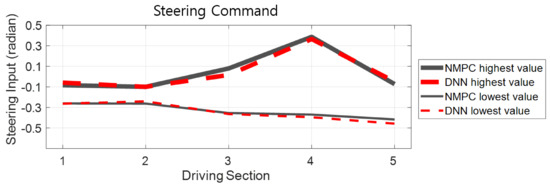 Table 4 shows the maximal and minimal steering control inputs in sections ① to ⑤ of the driving trajectory. Figure 16 shows the values presented in Table 4. Moreover, Figure 16, shows that the steering control inputs calculated by the NMPC and DNN controllers along the sections were similar; thus, the DNN controller was well trained and exhibited performance characteristics similar to those of the NMPC method.