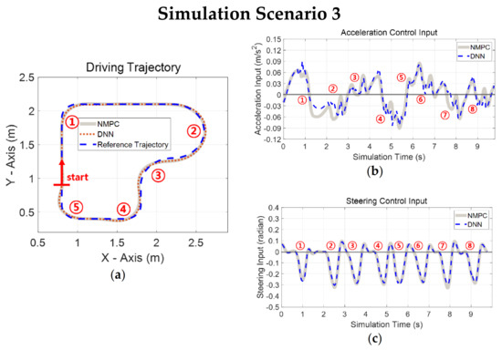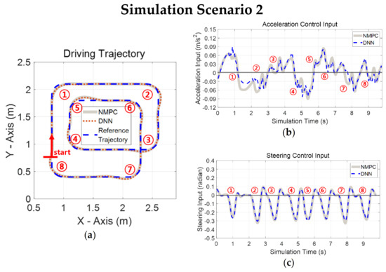 The simulation results of scenario 1 are shown in Figure 9. The trajectory of the vehicle controlled by the DNN controller was very similar to that of the NMPC method. The NMPC method is advantageous because the optimal control input follows the target trajectory by predicting the future trajectories. Therefore, the vehicle can smoothly follow the desired path around the sharp corner by changing the driving direction before entering the corner.