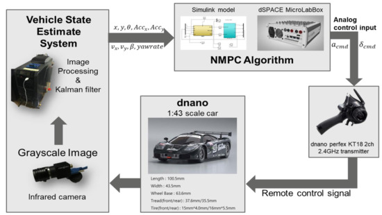 The test environment is shown in Figure 12. The vehicle posture was obtained by processing the images obtained with an infrared camera at the top of the test track. The NMPC and DNN controllers were implemented on a real-time computing platform, thereby enabling vehicle control with wireless controllers.