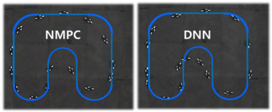 The driving trajectories of the DNN controller and the NMPC were very similar in the scaled-car environment test (see Figure 14).