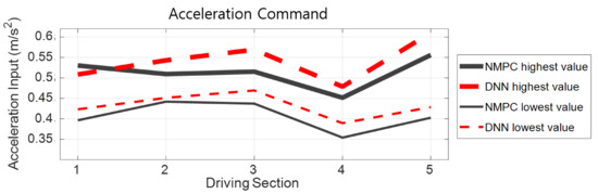 Table 3 shows the maximal and minimal acceleration control inputs of both controllers for sections ① to ⑤ of the driving trajectory shown in Figure 13. The scale car made several laps of the entire track and the highest and lowest commands are listed in the Table 3. Figure 15 presents the values in Table 3 to show the similarity between the NMPC and DNN controllers. Although the acceleration inputs were not exactly identical, the acceleration commands showed similar patterns along the section; in addition, the overall acceleration control inputs of the DNN controller were slightly higher than those of the NMPC.