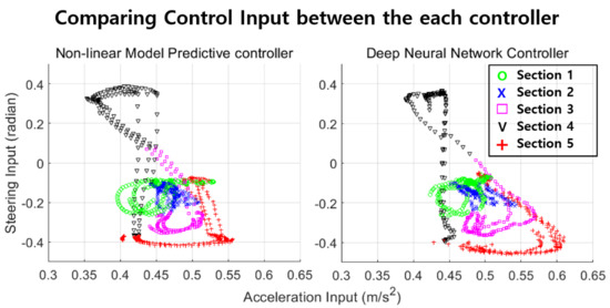 Figure 17 presents the acceleration input versus the steering input according to the driving sections. The graphs of the NMPC and DNN controllers showed similar patterns that followed the corner sequence; this confirms that the control strategy of the NMPC is inherited by the DNN controller through learning.