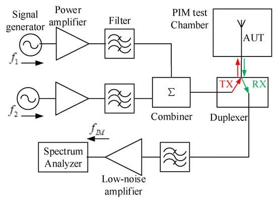in which and are positive integers. When it is an even number, the frequency of is usually so far from the operating frequency band of the system that it can be ignored. Of the odd PIM signals, the amplitude of the third-order PIM is the largest. Therefore, PIM measurement usually detects the magnitude of the third-order PIM, and the measured results are used to estimate the value of the higher-order PIM. The system architecture for measuring the level of PIM is shown in Figure 1.