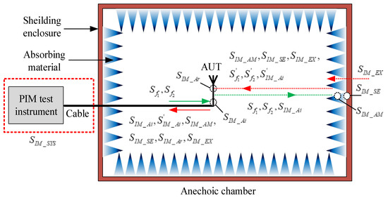 The PIM signals that may be generated during the PIM test is shown in Figure 2. and , are the frequencies of two working signals. is the PIM signal generated by the AUT as a result of the mixed transmitting signals and ; is also generated by the AUT but is a result of the receiving signals and ; is the reflected signal of ; and are the PIM products generated by the absorbing material and chamber wall, respectively; is the signal from the outside owing to the ineffective shielding of the anechoic chamber; and is the PIM signal from the test instrument owing to non-linear devices, such as amplifier, filter, duplexer, cable, and so on.