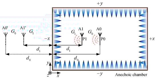 As shown in Figure 3, the position P0 is the center of the PIM measurement chamber. In reality, the antenna is usually placed at this position for measurement in order to achieve minimal reflection. It is assumed that the PIM of a directional antenna A0 with a gain of G0 is measured at position P0, and that the PIM of a directional antenna A1’ with a gain of G1 is measured at position P1. The main radiation directions of both antennas are toward the direction. Since most of the energy of a directional antenna is concentrated in the main radiation direction, only the reflection from the plane needs to be considered, and the reflection from other surfaces can be ignored. Then, Equation (5) can be used in this situation. The following two formulas can be obtained:
