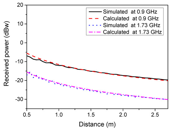 When the distance is short, simulation results can be used to assist the calculation. The simulator used in this paper is the High Frequency Structure Simulator (HFSS). Figure 4 shows the received power obtained by simulation and calculated by the Friis formula. The horizontal axis is the distance from the transmitting antenna to the receiving antenna. Antennas used in Section 4 are calculated with a gain of 10.5 dBi at 0.9 GHz and 8 dBi at 1.73 GHz. The transmitted power is set to 0 dBw. Thus, the Friis formula is consistent with the simulation when the distance is long. The Friis formula is less accurate when the distance is short, and the simulated received power can be used to calculate the correct measurement distance using Equations (6) and (7).