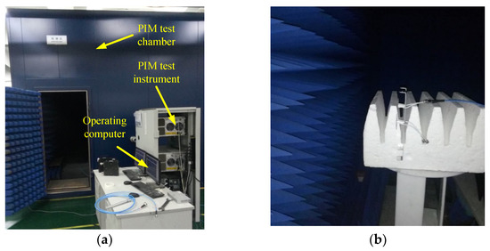 As PIM levels are very low compared to the power of carrier, the test results are prone to interferences from external signal sources. Therefore, it is necessary to ensure that there are no interfering signals in the environment during measurement. In reality, it is difficult to guarantee a completely interference-free environment. Hence, the device under test (DUT) is usually measured in a shielded anechoic chamber. The anechoic chamber shields the interference from external signals and reduces the space reflection, which is widely used in microwave measurements [15,16,17,18,19,20]. The use of an anechoic chamber can also greatly improve the accuracy of the PIM measurement, especially for radiating components such as antennas.