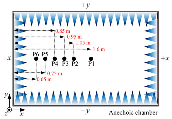 The first experiment was used to verify the feasibility of the method of changing the distance to achieve an equivalently high gain. This experiment was performed mainly in the PIM chamber A illustrated in Figure 6a. As the residual PIM level is relatively large in chamber A, the measured results will more clearly reflect the change. As shown in Figure 7, six points at different distances from one side of chamber A were selected for measurement. The six points are at the same height, and only the position in the direction is different. The environment within the chamber is shown in Figure 6b. Each position was measured for PIM values at three different powers. Prior to the measurement, a low PIM load without radiation was measured in the chamber to show the noise level from the test instrument and cables. The low-frequency and high-frequency measurement results are shown in Table 1 and Table 2, respectively. The equivalent gain is obtained by using Equation (10). It can be seen that, regardless of the frequency of the antenna, the PIM values increase as the measurement distance decreases. When the measurement distance is changed from 1.6 m to 0.65 m, the PIM level of the antenna increases by approximately 10 dB at 43 dBm (low-frequency increases by 9.98 dB, high-frequency increases by 11.85 dB), which is a large deviation. In the case of low power, the reflected signal is very weak. For example, it may be less than −130 dBm, which is the measurable minimum of the PIM test instrument. This small level will not affect the measurement results. Thus, the change caused by the distance is not obvious. These results are consistent with the analysis in Section 3. That is, when the distance is reduced, the received power of the antenna increases, and a higher PIM level is received. It can be seen from the results of the measurements that chamber A may result in errors when measuring a high-gain antenna. For example, an antenna with a gain of 13 dBi at 900 MHz needs to be measured at 43 dBm, while the PIM index requirement is lower than −160 dBc. Any antenna that meets the index does therefore not meet the requirements, as the noise of the chamber itself is greater than −160 dBc in this situation.