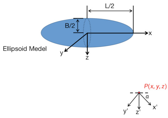 Generally, the ship can be approximately modeled as a prolate spheroid one, shown in Figure 1 [16]. The semi-major axis of the ellipsoid can be taken as half the length of the ship (L is the length of the ship), and the semi-minor axis of the ellipsoid can be taken as half the width of the ship (B is the maximum ship width of the ship). The coordinate system is established with the center of the ship as the origin, where the x-axis direction as the longitudinal direction and the z-axis as vertical downward. The ellipsoid is uniformly magnetized along three coordinate directions in the terrestrial magnetic field, and its corresponding magnetic moment is . Thus, the magnetic field generated at the measuring point is:
