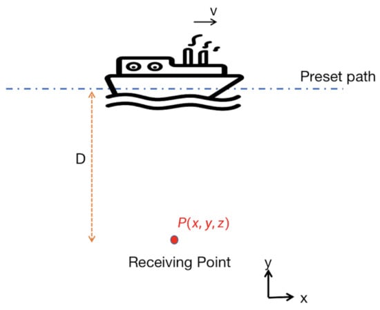 Since the geomagnetic field can be regarded as stable, the sinking equipment can work for a while to collect the geomagnetic field. Then, the target’s magnetic field can be obtained by subtracting the geomagnetic field from the recorded data when the ship passes. The schematic of the experiment is shown in Figure 4. From the figure, we can see that the ship would sail at a constant speed v along the planned lines, and the experiment would repeat at different distance abeam D: 0 m, 10 m, 20 m, 30 m, 40 m, and 50 m at the speed of 8 knots. The GPS system is used to record the required data to ensure that the trajectory of the ship meets the preset requirements and also is set as the standard for our algorithm. Light wind is acceptable to make sure the target can move as planned, and this would also assure that the sea depth would not change a lot because it can be used as a reference to evaluate the performance of the method, which would be discussed in Section 4.