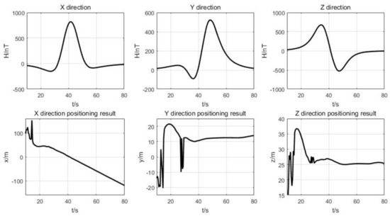 Since the ship moves along the x-direction at a fixed speed shown in Figure 4 the position change in the x-direction should be an inclined straight line with the slope of the ship’s sailing speed on the time axis, and there is basically no change in the y and z directions. The localization result is shown in Figure 5, where the upper 3 are the received magnetic field and the lower 3 are the localization results. From the figure, it can be seen that the time node at which the localization results have been significantly improved appears at approximately 0 m in the x-direction when the ship is closest to the magnetic sensor to make the magnetic field signals the strongest. In the later stage of the algorithm, the localization distance in the y-direction converges to around 12.5 m, and the localization distance in the z-direction converges to around 25.2 m, which are in good agreement with the actual situation. However, in the initial period, when the ship is far from the sensor, the magnetic field signal is weak to make the noise-to-signal ratio non-neglectable, which has a greater impact on localization. As the ship gets closer to the magnetic sensor, the target magnetic field signal gradually increases, leading to the increase of the signal-to-noise ratio to make more magnetic field data effective, thus the localization result will gradually get better.
