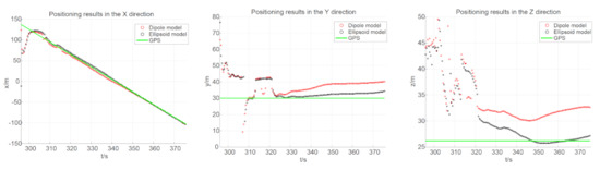 The localization results of the ellipsoid model and the single dipole model at a distance abeam of 30 m are also compared, the results of which are shown in Figure 6. From the figure, it can be easily seen that the ellipsoid model would converge to the preset values when the magnetic dipole model still has a large deviation. Because the real value of the sea depth would not change a lot, the localization results of the z-direction from both source models are illustrated in Table 3. We can see that the spheroid source model is better than the magnetic one with the largest difference of 1.86 m to 12.01 m respectively. The corresponding relative errors from Equation (9) are and , which validates the proposed assumption that the spheroid source model is better than the magnetic dipole model at the near area localization.