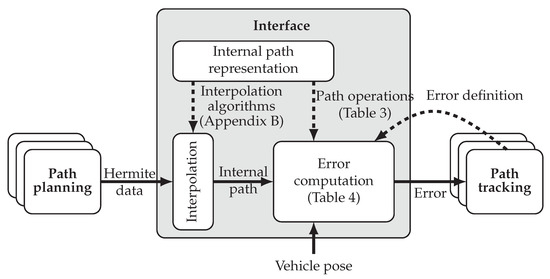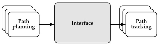 This publication is dedicated to the design of such an interface, between the local motion planning system and the path tracking system, which is an essential part of every AD function. The interface, hence, shall be able to connect a comprehensive set of state-of-the-art path planning and path tracking algorithms (see Figure 1), resolving performance interdependencies to the greatest possible extend. This is of special interest for example in collision avoidance, see for example [9,10], since it requires an accurate coordination of path planning and tracking.