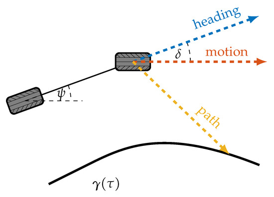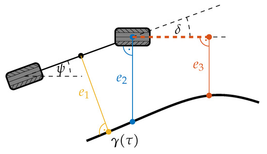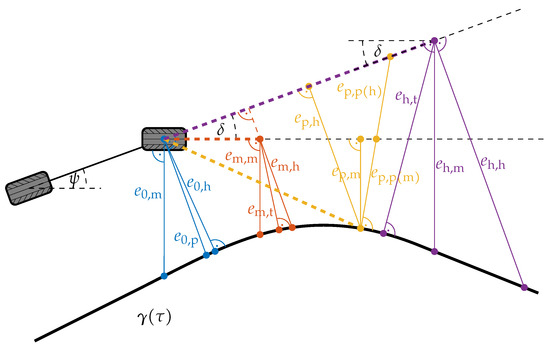 according to (7), (9) and (10). Figure 6 exemplarily illustrates all possible error definitions for the vehicle reference at the front axle, i.e., for the set , as listed in Table 1. In the case of a look-ahead towards the path and an error orientation perpendicular to the path, the lateral error has to be defined either with respect to the vehicle heading or motion (see errors and ).