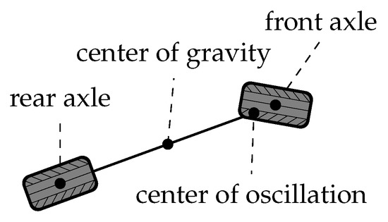 - Center of oscillations/percussion: In the center of oscillation or percussion, the translation and rotation impact of a lateral tire slip at the rear axle are in balance. Consequently, this point is of special interest in order to design control laws, which are robust with respect to lateral rear axle tires slip. The choice of this reference point is popular in tracking controllers designed for limit-handling, as racing applications (see for example [17,18]). For front-wheel-steered vehicles the position of the center of percussion with respect to the rear axle is:where is the distance of rear axle and center of gravity, m the vehicle mass and the vehicle’s inertia in the center of gravity with respect to the vertical vehicle axis.